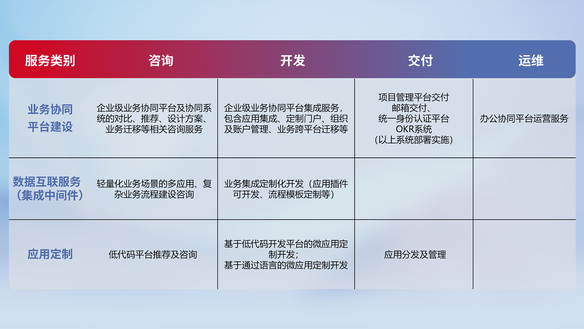 针对钉钉、、企微、、、IDaas等平台级产品提供产品的规划、、、、方案、、交付、、定制化开发等服务,,实现如统一协同办公、、、、智能客户服务、、、混合会议管理、、智能数据查询、、、等业务场景,,,实现数字化转型。。